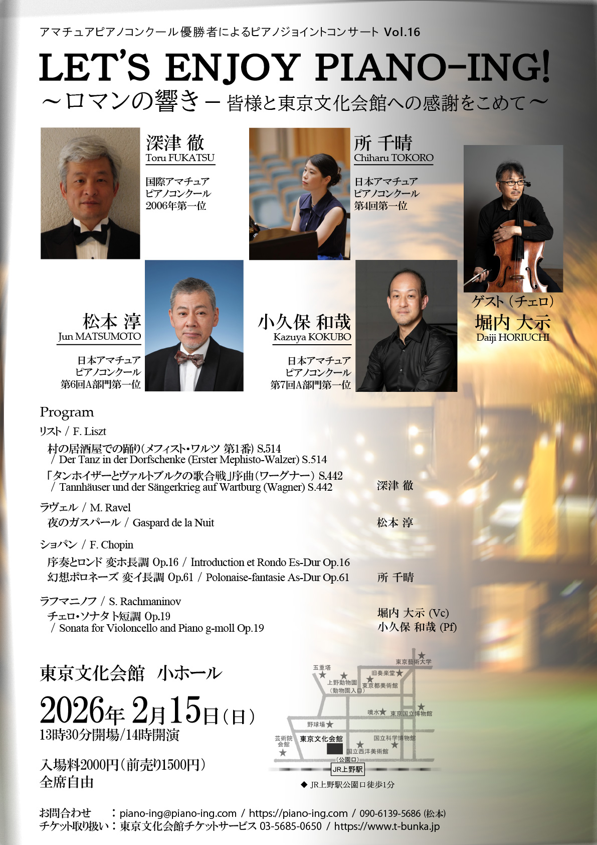 過去の Let’s enjoy Piano-ing vol.1-10 におきましては、予想を上回る 多数のお客様にご来場頂き、出演者一同心から感謝しております。ありがと うございました。 今回は古典、ロマ […]